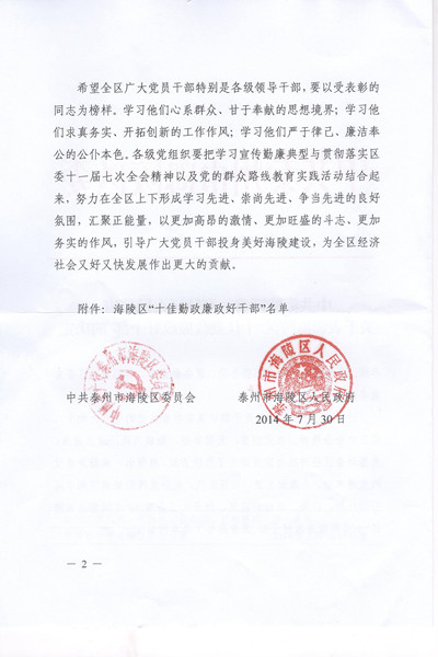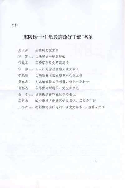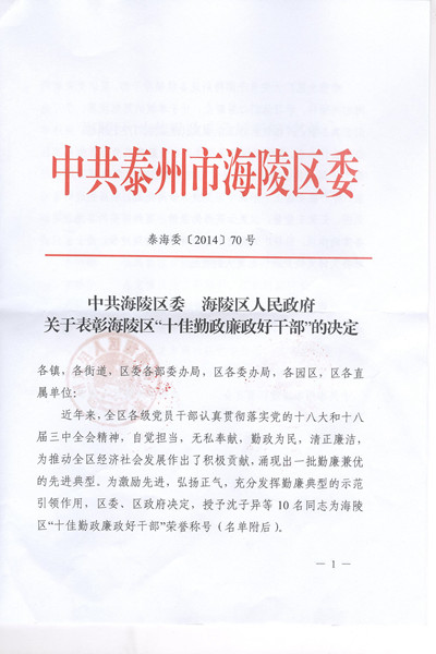 30日,海陵区委、区政府作出《关于表彰海陵区“十佳勤政廉政好干部”的决定》,我院民一庭副庭长环震同志名列其中。
