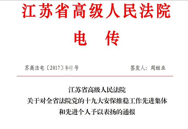 12月12日,省高院作出了《江苏省高级人民法院关于对全省法院党的十九大安保维稳工作先进集体和先进个人予以表扬的通报》,我院立案庭庭长徐秀芳同志被表彰为先进个人。