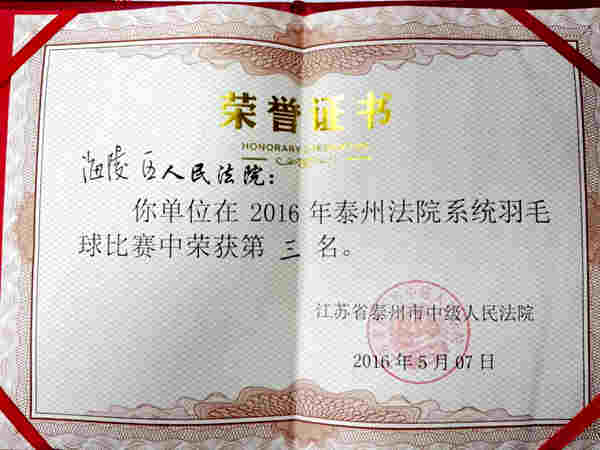 近日,泰州市中级人民法院组织羽毛球比赛,我院参赛选手刻苦训练、团结拼搏,为我院赢得了团体第三名的好成绩。