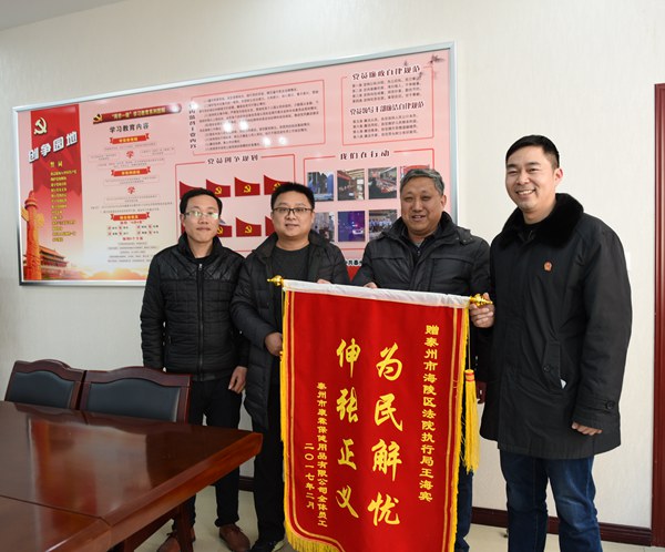 “感谢你们,你们辛苦了!我们代表80多名工人给法院执行人员送锦旗表示谢意!”2017年2月14日,我院执行局来了一群带着锦旗的群众,他们不是来起诉立案也不是来法律咨询,而是专门送来锦旗,感谢执行干警不辞劳苦为民追薪,让他们过了个安心的好年。
