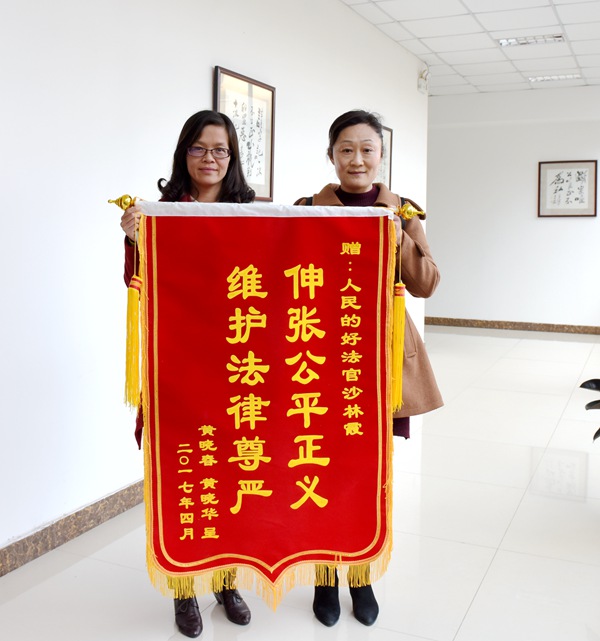 2017年4月12日下午,黄某来到extra48365365,将一面写有“伸张公平正义、维护法律尊严”的锦旗送到了民一庭法官沙林霞的手中,对该院受理的金某诉黄某民间借贷纠纷一案的公正审理一再表示感谢,黄某表示沙林霞法官对工作认真负责的态度令其深受感动。
